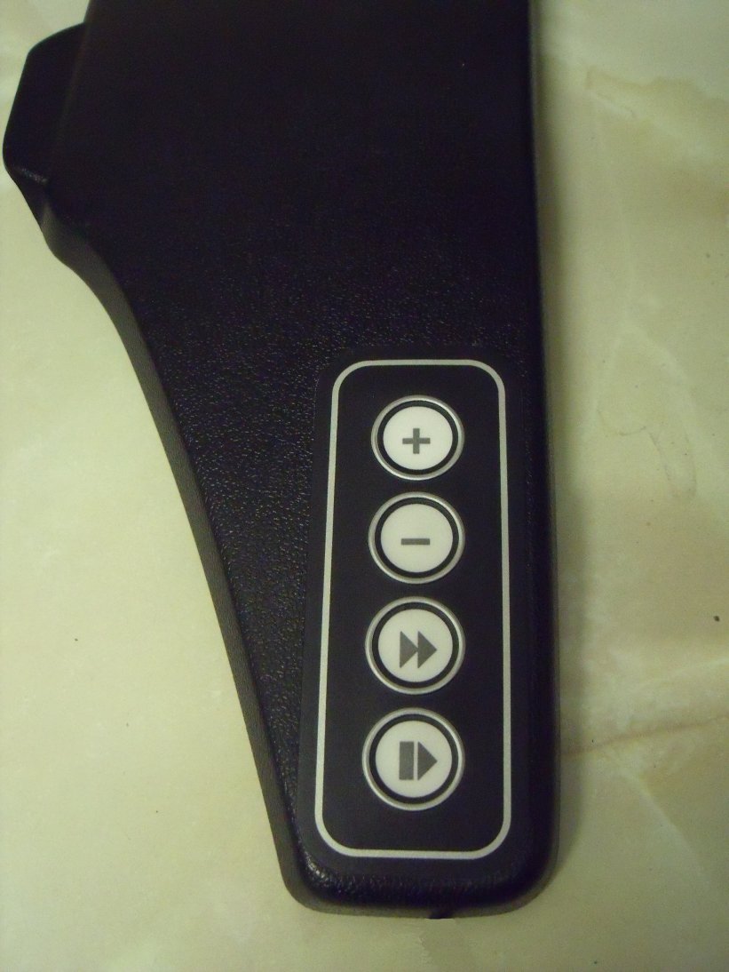 I finally got round to resolving the MP3 player remote control: you recall that the Zen Micro's wired remote was stashed in the glovebox, but of course it was nigh-on impossible to operate the titchy buttons whilst wearing gloves, let alone while riding along on cruise control. I found the solution in a self-adhesive keypad; initially I thought I was going to have to buy one bigger than I needed and have several spare buttons but after a bit of thought I decided that I could get away with a 4-button keypad as seen here: